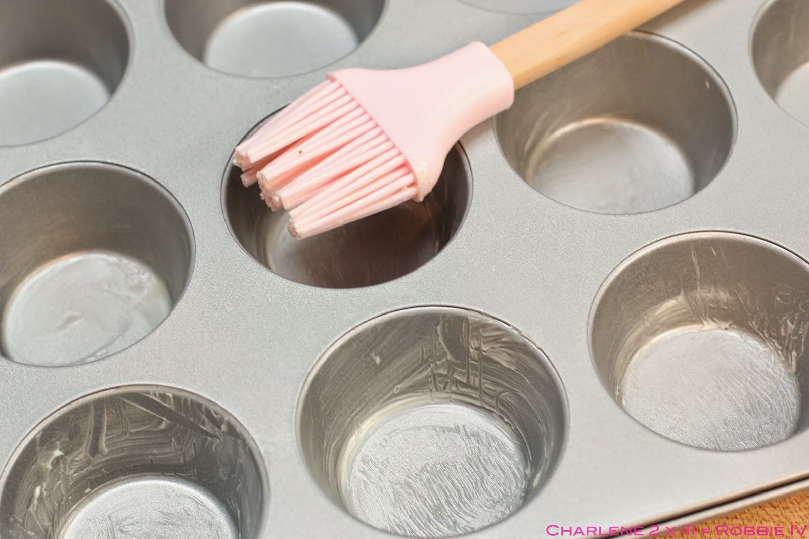 4. 送入烤箱前,先將馬芬烤盤內側塗抹一層厚厚的奶油(配方外)防沾,一起送入預熱好的烤箱加熱5-7分鐘