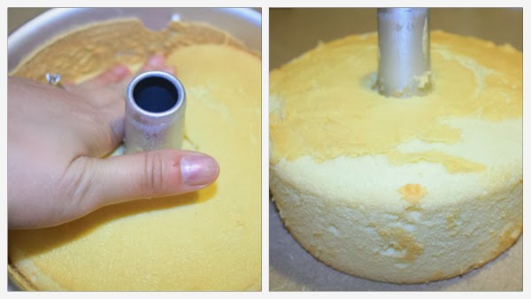 關於烤溫說法各異,有人喜歡酥鬆的口感,會用較高的溫度下去烤,所以戚風蛋糕的表面就會裂開。有人為了裂的好看,也會烘烤5分鐘之後取出,用利刃在表面劃線,最後烤出來就會像開花似的美麗。我個人喜歡綿密濕潤的口感,也不喜歡蛋糕裂開的樣子,所以使用低溫烘烤。缺點就是放涼之後表面會微微的回潮,會有一層黏黏的皮(下面可以看到),好在這層皮可以用塗烤肉醬的刷子刷掉,而且蛋糕成品會是倒扣的狀態,其實根本看不到皮^^